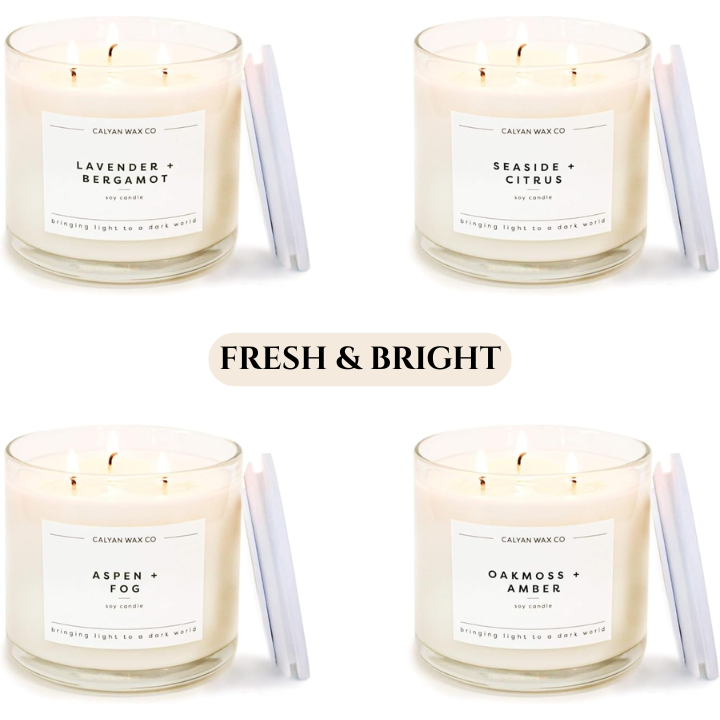 Fresh & Bright: Lavender + Bergamot, Seaside + Citrus, Aspen + Fog, Oakmoss + Amber.